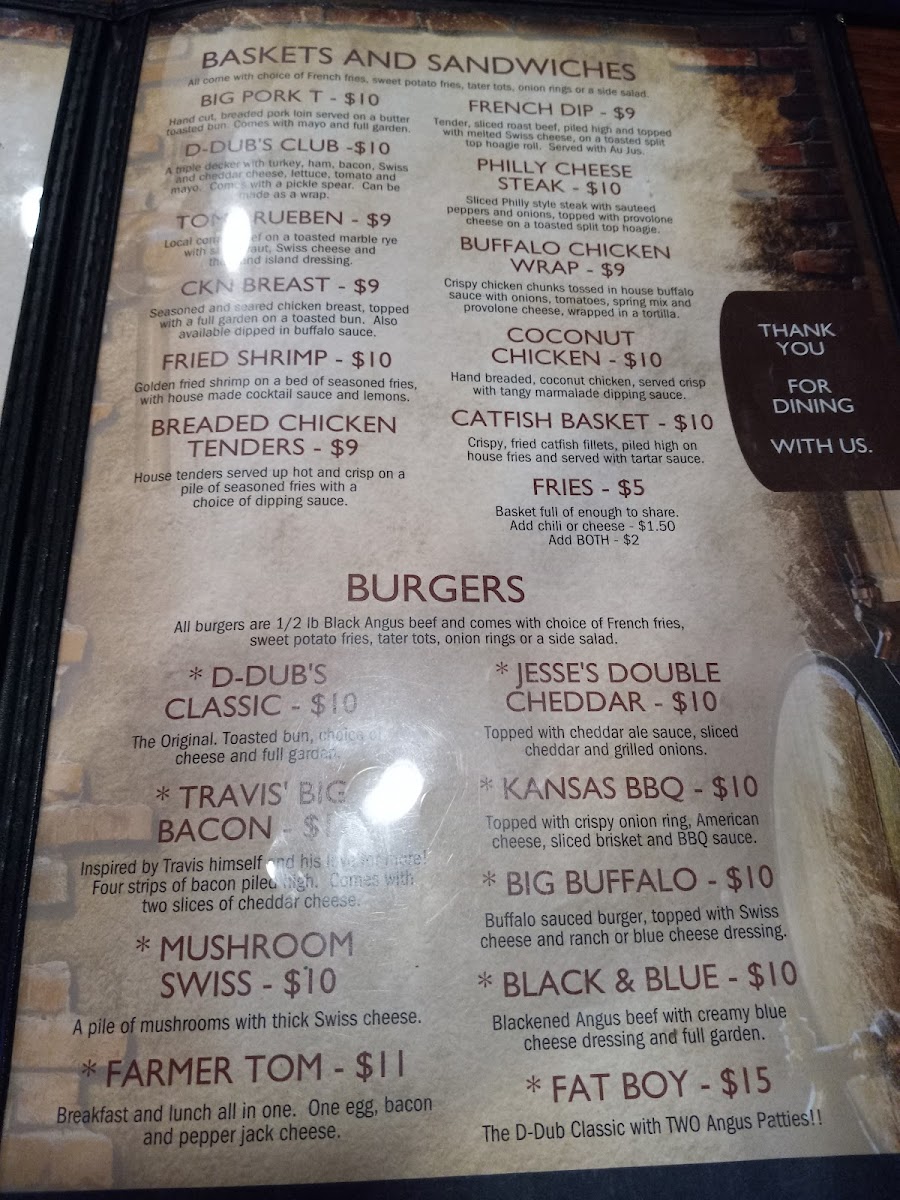 The menu at D-dubs Bar And Grill offers a straightforward and approachable selection of hearty bar and grill favorites. It’s the kind of menu that invites casual dining, whether you’re stopping by for a satisfying meal after a day out or settling in for a relaxed evening with friends.